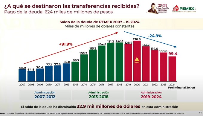 - La deuda de Pemex ha disminuido en 32.9 mil millones de dólares durante el actual sexenio.