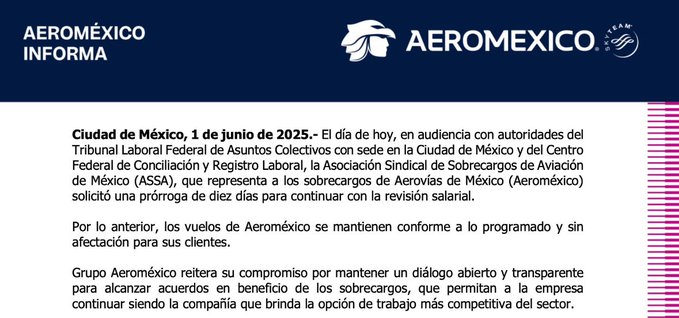 Por su parte, Aeroméxico confirmó que sus operaciones se mantienen conforme a lo programado y sin afectación para los pasajeros. La aerolínea reiteró su disposición a mantener un diálogo abierto para lograr acuerdos que beneficien a los sobrecargos, al tiempo que se garantice la competitividad de la empresa en el sector.