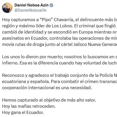 El presidente Noboa anunció la captura en redes sociales. Aseguró que “Pipo” fingió su muerte, cambió de identidad y ordenaba asesinatos desde Europa, además de operar rutas de droga junto al Cártel Jalisco Nueva Generación (CJNG) y controlar actividades de minería ilegal.
