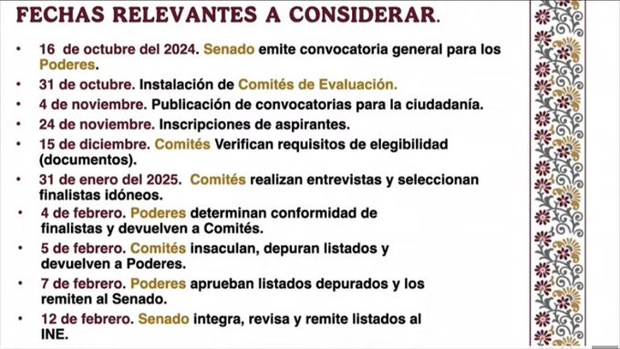 - 31 de octubre: Instalación de los comités de evaluación por cada uno de los tres poderes de la Unión.