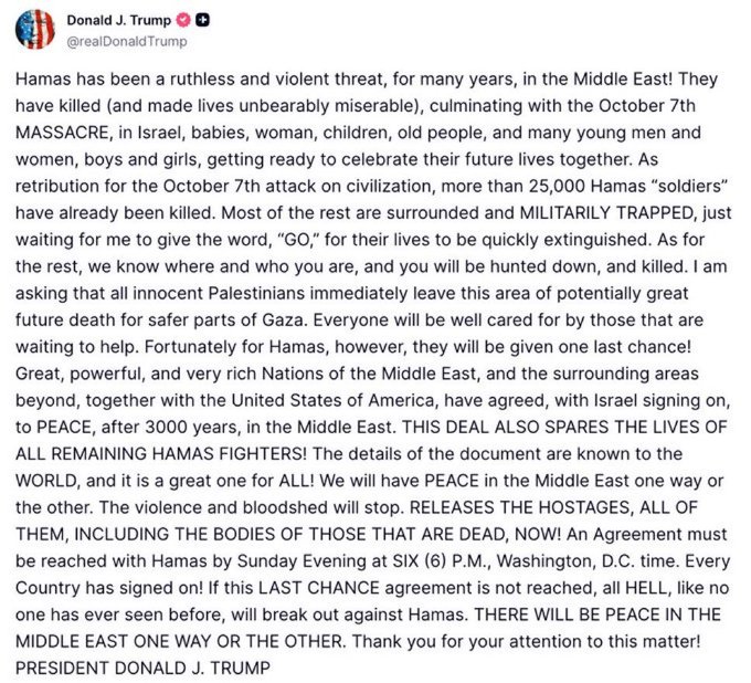 “Si no se alcanza este acuerdo de última oportunidad, se desatará un infierno como nunca antes se ha visto contra Hamás. Habrá paz en Medio Oriente de una forma u otra”, advirtió el mandatario.