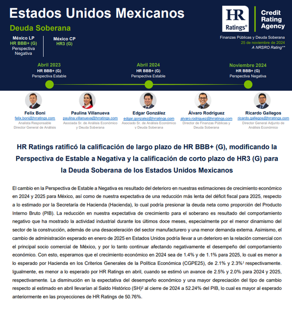 - HR Ratings cambia la perspectiva de México de estable a negativa.
