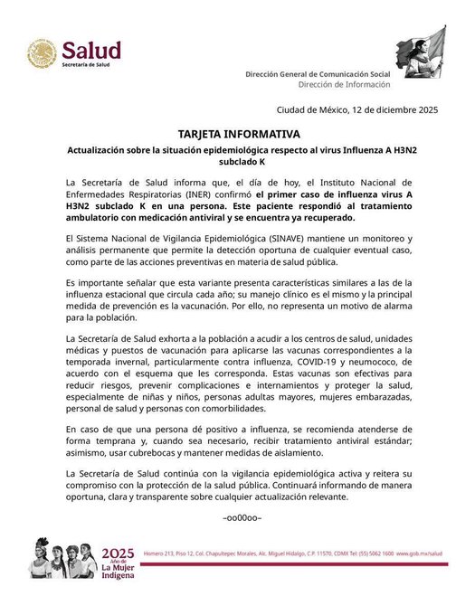 La Secretaría de Salud confirmó la detección del primer caso de influenza A(H3N2) subclado K en México el 12 de diciembre. El diagnóstico fue realizado por el Instituto Nacional de Enfermedades Respiratorias, que informó que la persona recibió tratamiento antiviral oportuno y se encuentra recuperada. Hasta el momento no se han reportado más contagios confirmados de esta variante en el país.