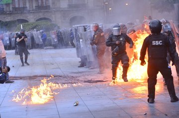 La conmemoración se tornó tensa cuando un grupo de encapuchados, identificado como “bloque negro”, vandalizó comercios en el Portal de Mercaderes, saqueó joyerías y lanzó bombas molotov. La policía capitalina respondió con gas lacrimógeno y escudos antimotines, lo que derivó en enfrentamientos y heridos. Brigadas humanitarias intervinieron para atender a los manifestantes afectados y contener los choques.