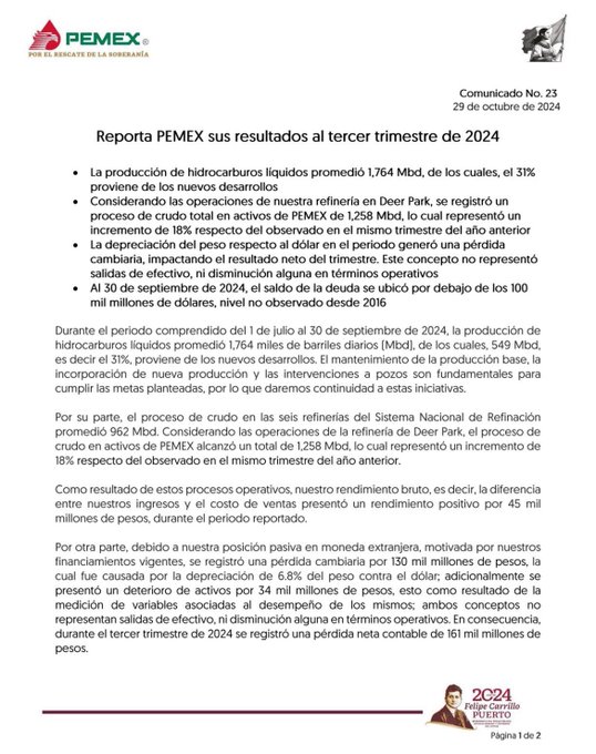 Pemex ha reportado pérdidas netas de 430 mil 103 millones de pesos en lo que va de 2024, lo que representa una caída del 14,319% en comparación con el mismo periodo del año anterior, cuando había registrado un beneficio de 3 mil 25 millones de pesos. Durante el tercer trimestre de 2024, la empresa reportó pérdidas netas de 161 mil 500 millones de pesos y pérdidas integrales de 138 mil 900 millones, atribuibles a la devaluación del peso frente al dólar y a una disminución del 17.8% en las ventas de exportación.