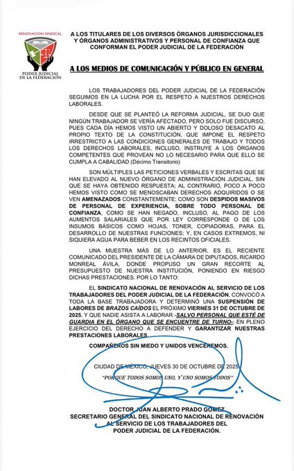 Trabajadores del Poder Judicial de la Federación, agrupados en el Sindicato Nacional Renovación (SNR), iniciaron este viernes 31 de octubre un paro de “brazos caídos” en protesta por despidos masivos y la falta de recursos materiales para desempeñar sus funciones.