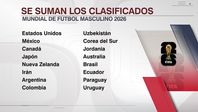 Además de los seis equipos sudamericanos, la Copa del Mundo contará con los tres anfitriones —México, Estados Unidos y Canadá—, junto a Nueva Zelanda por Oceanía y seis representantes de Asia: Japón, Irán, Jordania, Uzbekistán, Corea del Sur y Australia.
